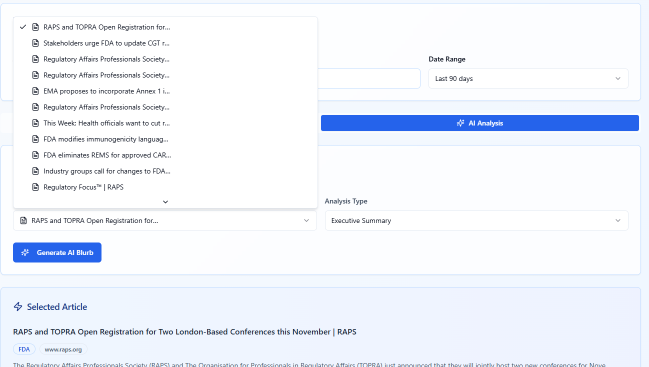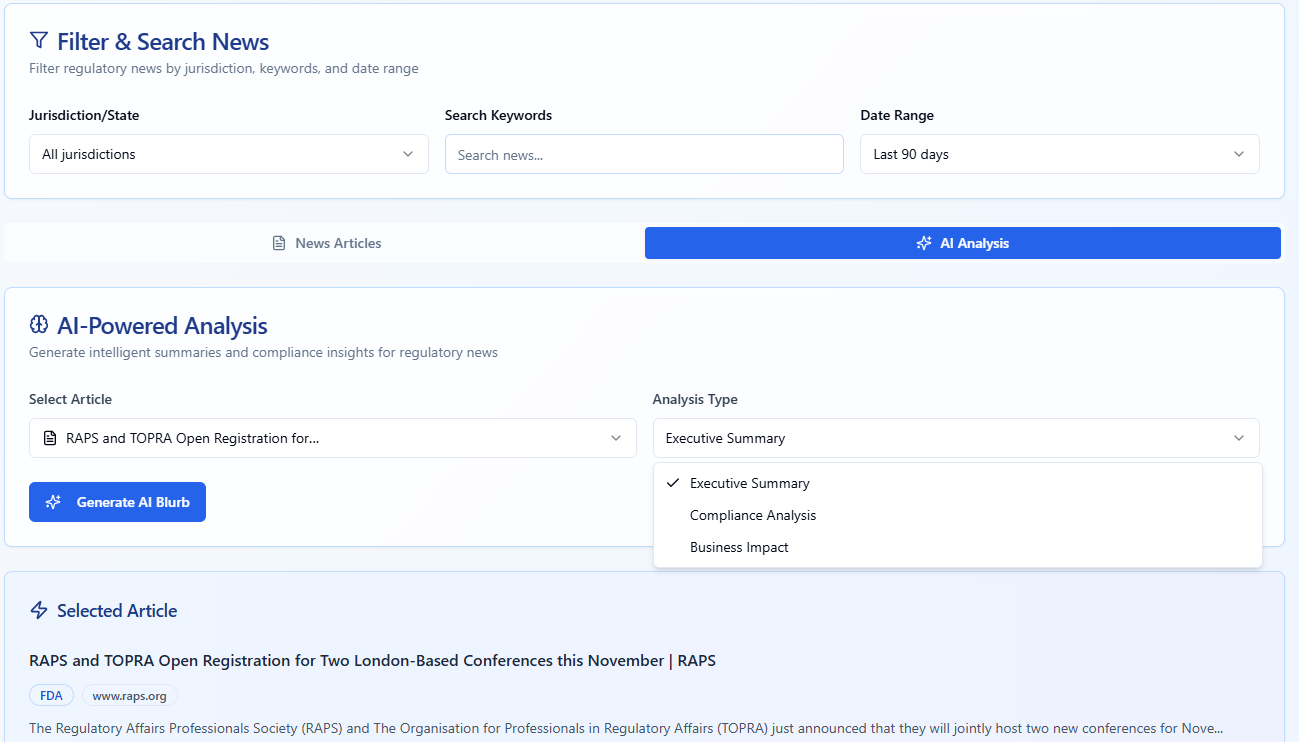 I built a powerful compliance monitoring platform for the pharmaceutical space. It aggregates and analyzes regulatory content from multiple sources and provides intelligent sorting, filtering, and analysis—all without relying on generative AI.